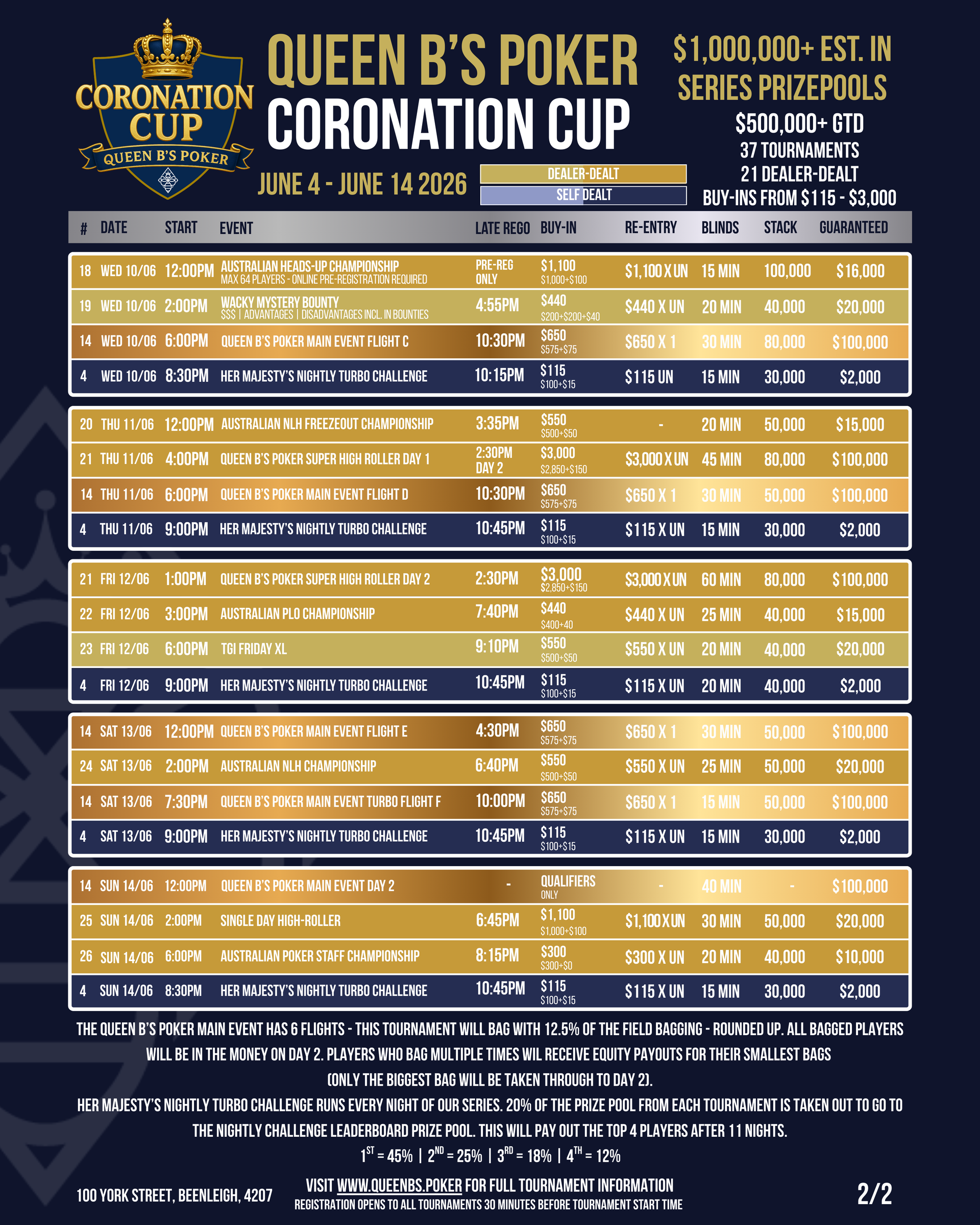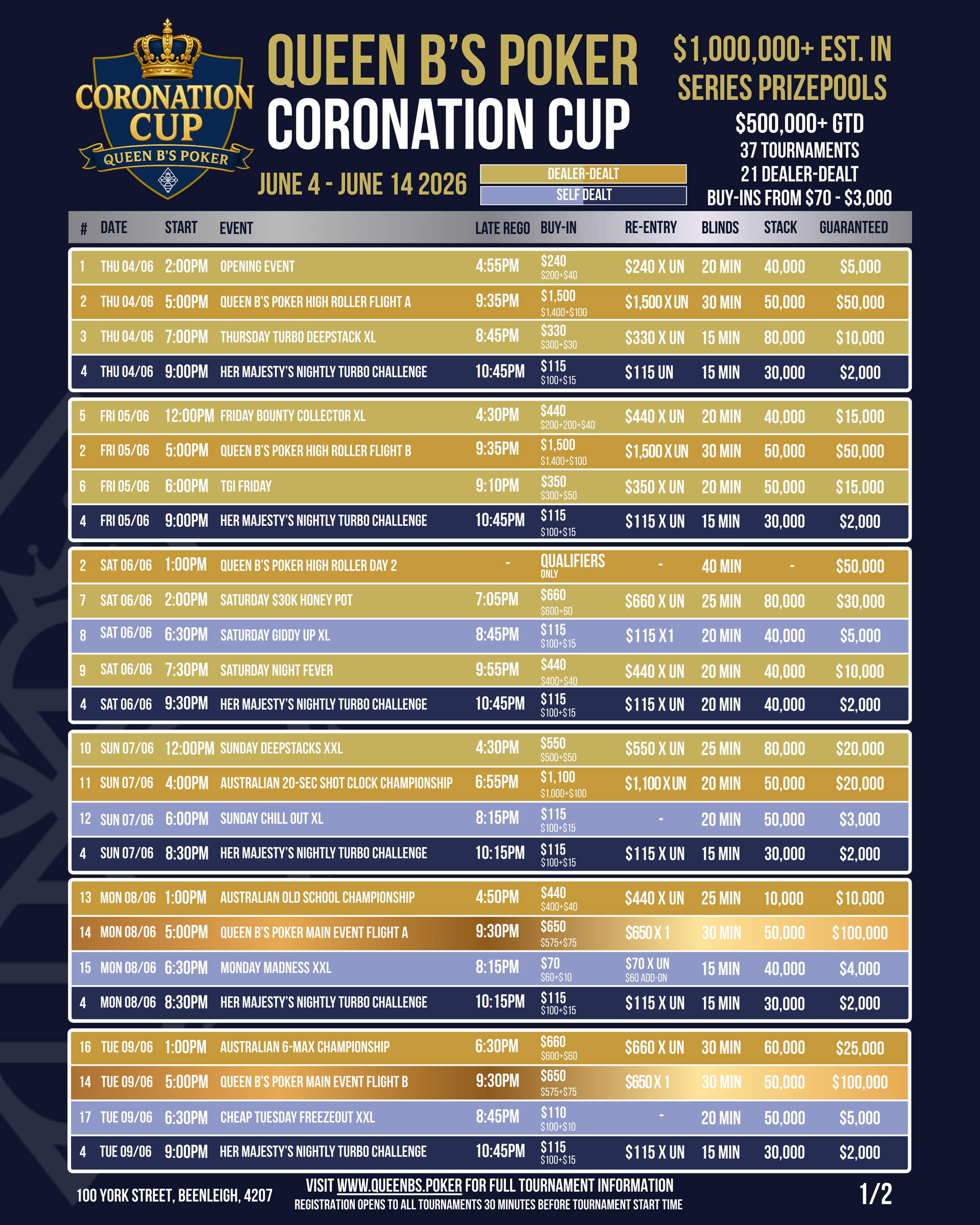 Our first major series at Queen B's Poker features 37 tournaments including 21 dealer-dealt events. We estimate $1 Million in prize pools.