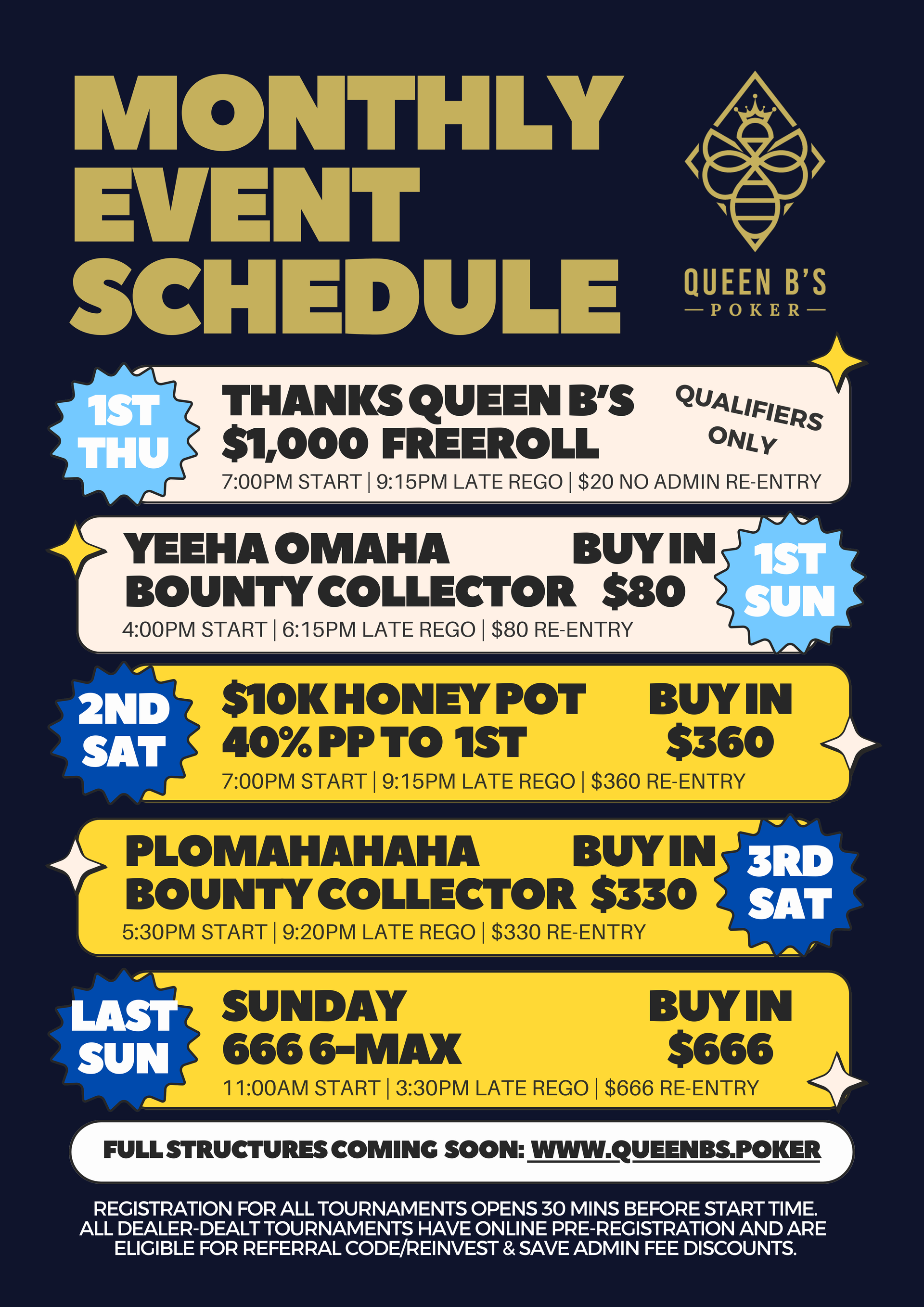 Queen B’s Poker brings you 5 regular monthly tournaments, including three fully dealer-dealt events. These special events provide a regular give-back freeroll for players, pot limit omaha offerings and well run high-roller tournaments.